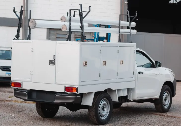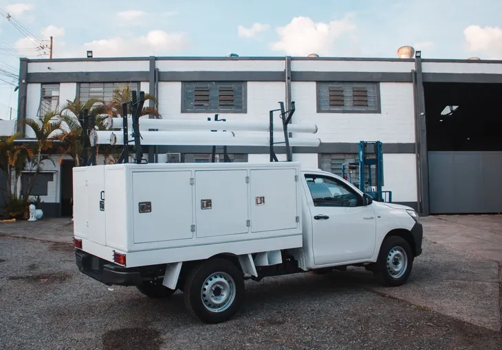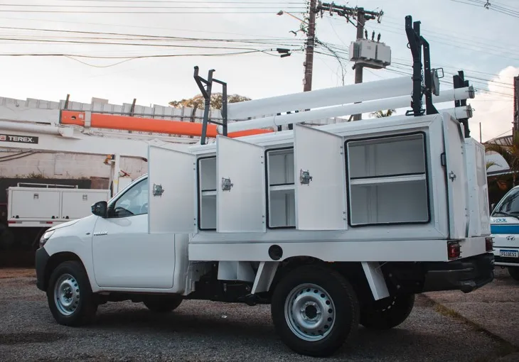 Carroceria modular compartimentada em aço ou alumínio com caixas laterais e acessórios específicos para operações de manutenção em serviços de instalação, manutenção em redes de distribuição de energia elétrica, aéreas, conforme referências normativas. Veja abaixo mais informações sobre esse implementos rodoviário.